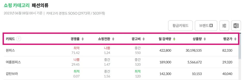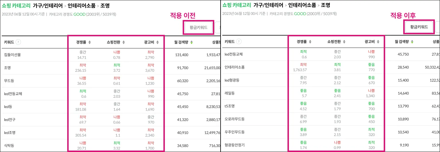 판다랭크에서 자체적으로 정의한 기준대로 경쟁률, 쇼핑전환, 광고비 등의 수치가 필터링 돼요.