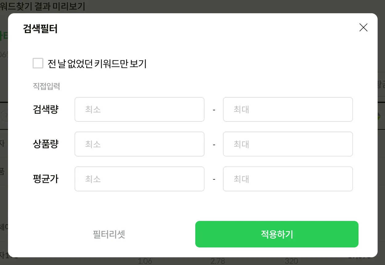여기에 각 항목에 필터링하고 싶은 수치를 입력하고, 적용하기를 클릭하면 입력한 수치에 맞는 키워드만 확인할 수 있어요.