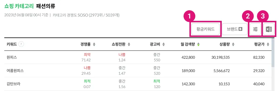 키워드찾기 안에 있는 수많은 키워드를 필터링하기 위한 기능은 크게 3가지에요.