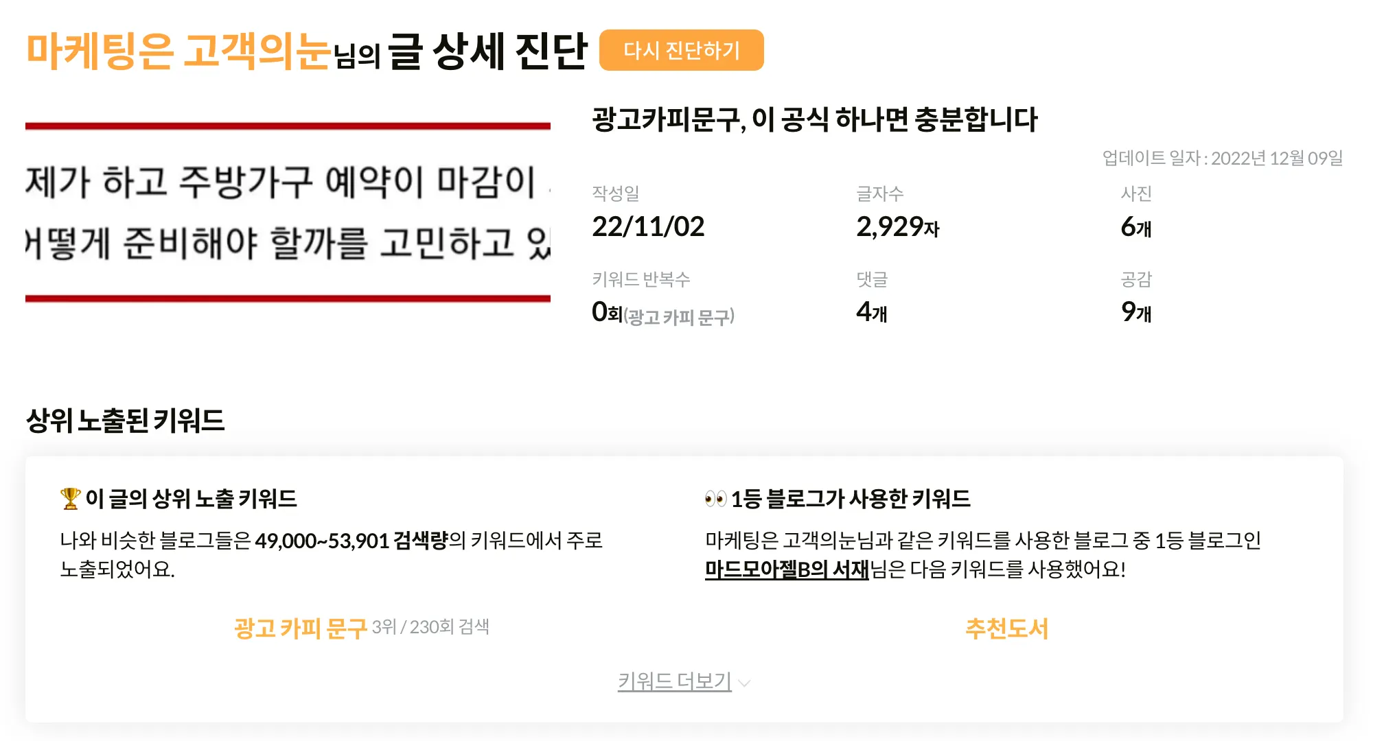 상단에서 글의 작성일, 글자수, 사진, 키워드 반복수, 댓글, 공감 등의 기본적인 정보를 볼 수 있어요.