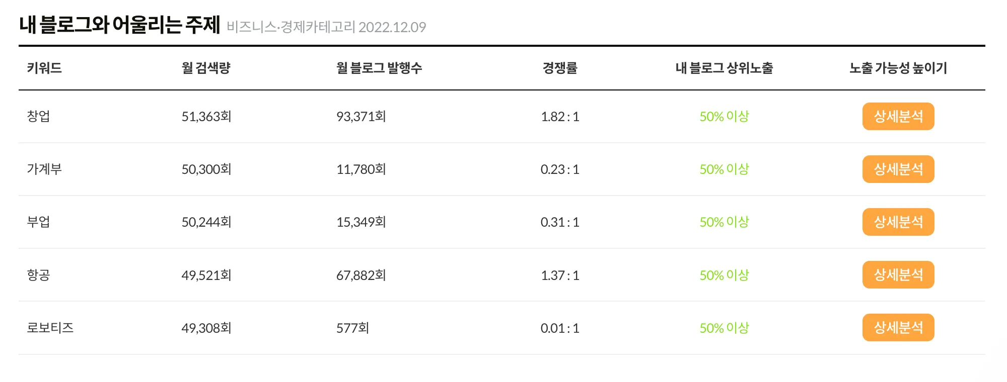 위에서 살펴본 경쟁자 블로그에서 주로 사용한 키워드만 쏙쏙 뽑아 어울릴만한 주제를 추천해드려요.