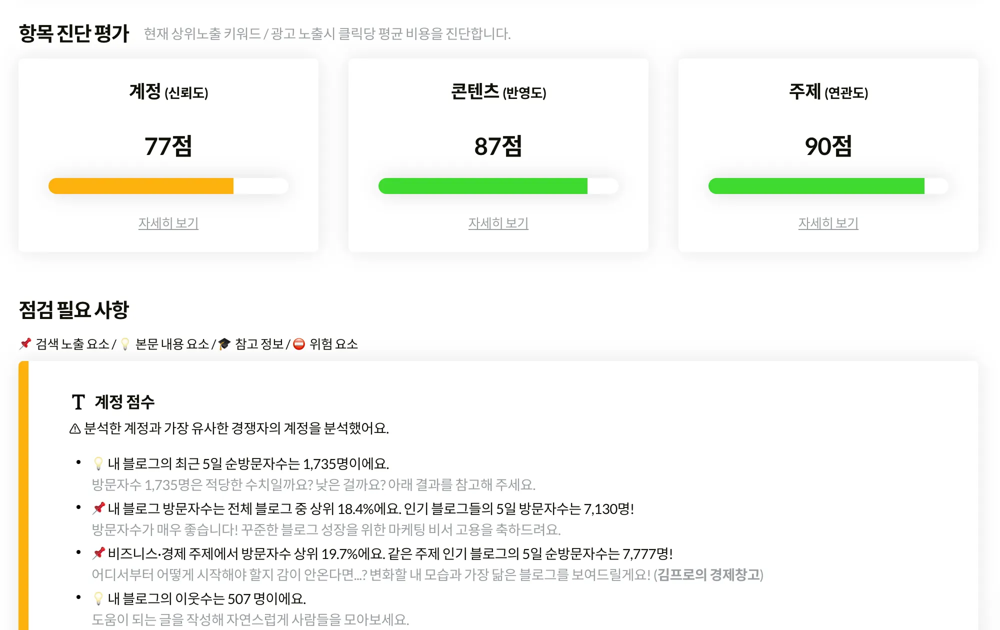 방문자수, 이웃수, 발행량 등의 계정과 관련된 점수를 진단해요.