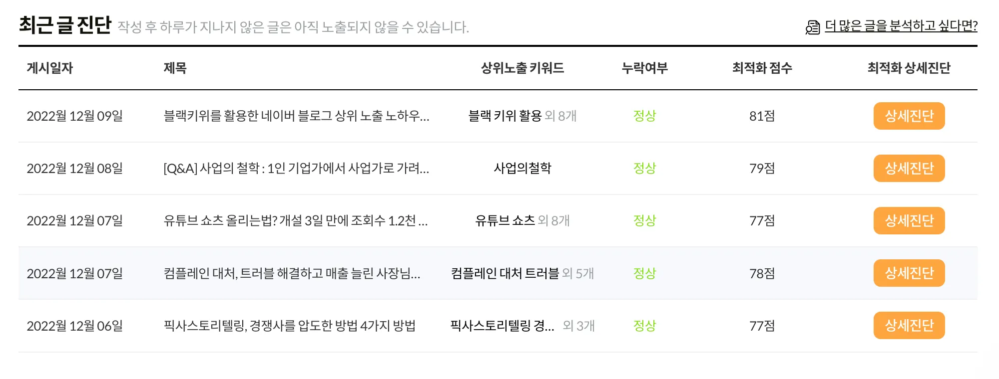 최근 5개 글 이전에 쓴 글의 분석이 궁금하거나 다른 블로거가 쓴 글이 궁금하다면 이용해보세요.