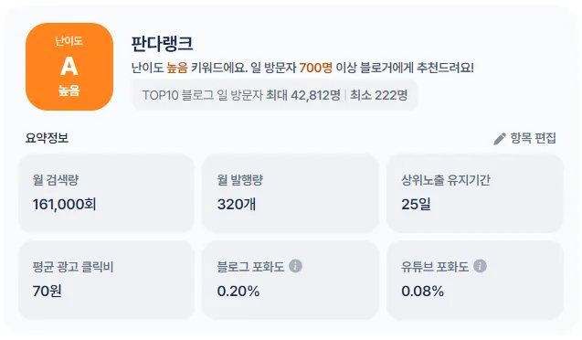 키워드 난이도 : 상위 블로거의 일 방문자 수를 계산해 난이도를 측정했어요.