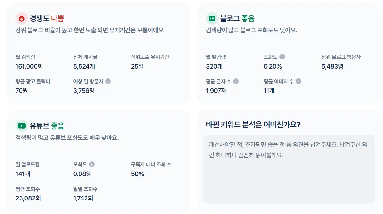 키워드분석 기능은 상위 노출시킬 키워드를 찾는 과정에서 확신을 가질 수 있도록 도와주는 기능이에요.
