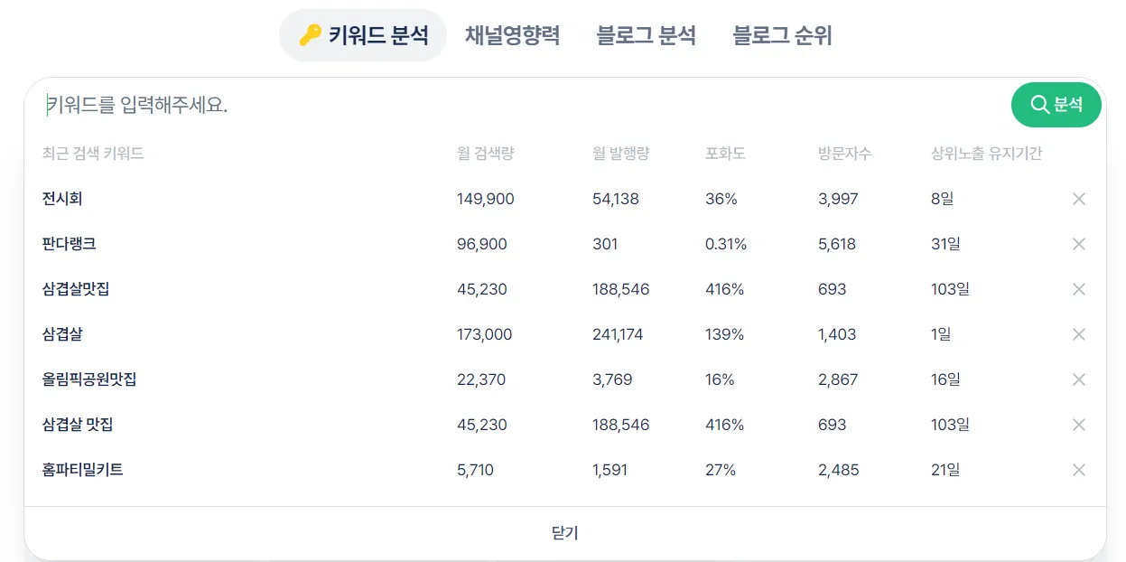 월 검색량, 블로그 포화도, 상위노출 유지기간 등으로 나에게 적합한 키워드를 찾아보세요.