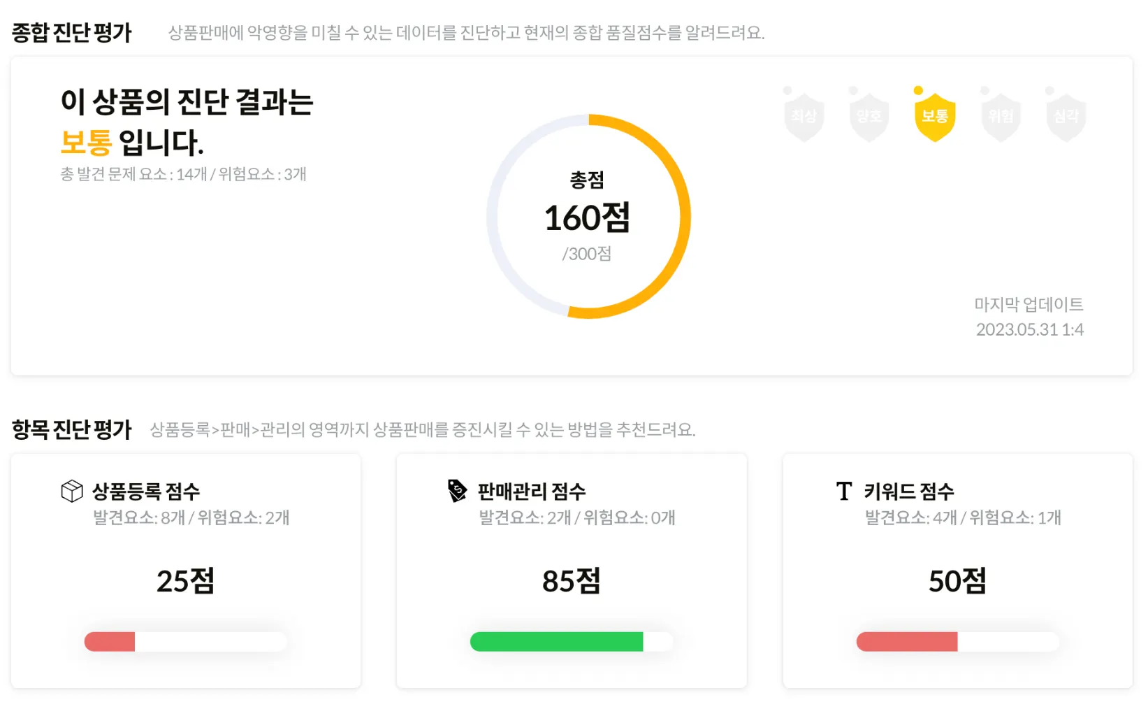 세 개의 지표 모두 잘 팔리고 있는 상품들의 통계를 기반으로 점수를 진단하고, 수정을 권장드려요.